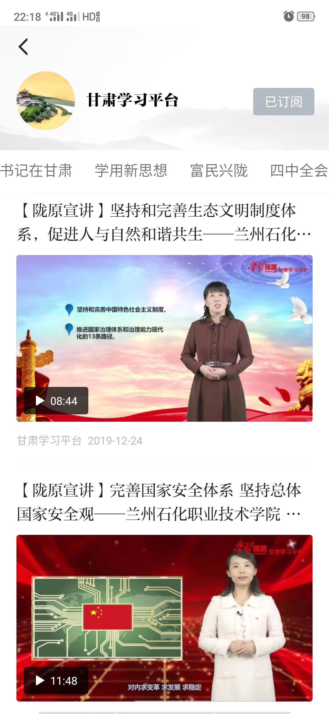 12月10日按照中共甘肃省委讲师团关于征集“党的十九届四中全会精神”宣讲慕课的函,要求组织中青年专家学者积极制作慕课,用小话题反映大主题,用小故事阐释大道理,用小切口剖析大问题,通俗化解读十九届四中全会精神,并择优在“学习强国”甘肃平台播发。接到通知后伟德国际1946源于英国高度重视,认真准备,推荐张媛、叶婷老师进行慕课录制并与19日报送至省委讲师团。经过评选张媛老师主讲的《坚持和完善生态文明制度体系,促进人与自然和谐共生》、叶婷老师主讲的《完善国家安全体系,坚持总体国家安全观》的慕课于12月24日在“学习强国”学习平台甘肃学习平台丝路讲堂中播发。