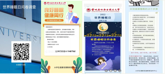 针对近期的心理活动日“世界睡眠日”开展多渠道心理活动,对公司员工睡眠状态进行调查,并制作宣传彩页,做好“良好睡眠、健康同行”的倡议,引导同学们在疫情期间养成良好睡眠习惯。