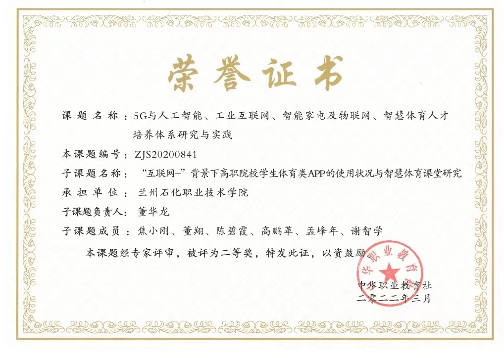 近日,中华职业教育社公布了关于《5G与人工智能、工业互联网、智能家电及物联网、智慧体育人才培养体系研究与实践》子课题的结项结果,伟德国际1946源于英国人文公司董华龙教授主持的《“互联网+”背景下高职院校员工体育类APP的使用情况与智慧体育课堂研究》子课题顺利结项,并获评二等奖。