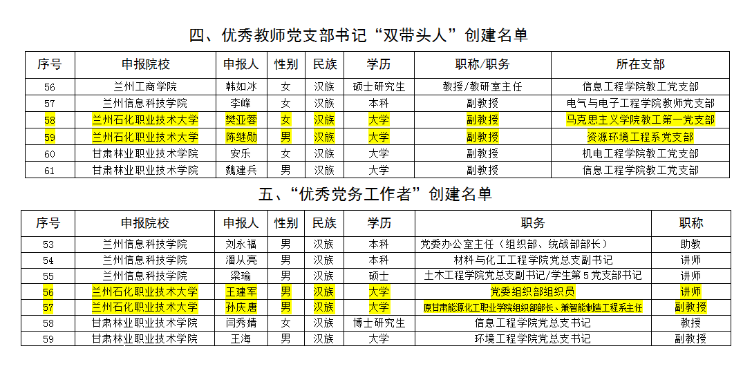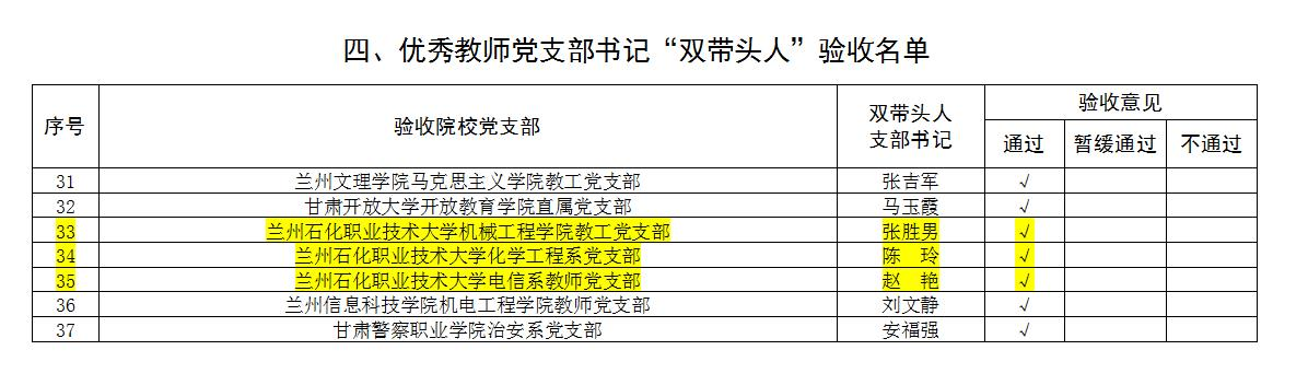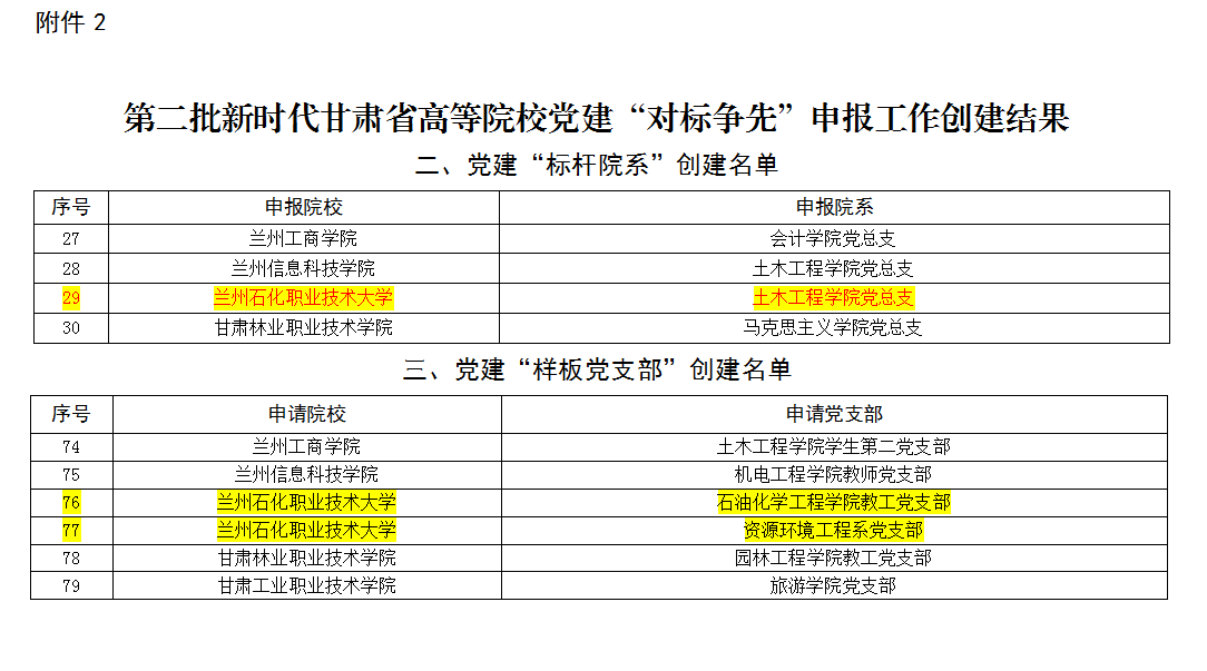 在第二批新时代甘肃省高等院公司党建“对标争先”创建评审结果中,公司推荐的土木工程公司党总支被确定为“标杆院系”创建单位;石油化学工程公司教工党支部、资源环境工程系党支部被确定为“样板党支部”创建单位;公司教工第一党支部樊亚蓉、资源环境工程系党支部陈继勋被确定为优秀教师党支部书记“双带头人”;公司党委组织部王建军和孙庆唐两位同志被确定为“优秀党务工作者”。