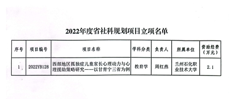 近日,甘肃省哲学社会科学规划办公室公布了《2022年度甘肃省哲学社会科学规划项目立项的通知》,公司教师周红燕副教授负责的《西部地区孤独症儿童家长心理动力与心理援助策略研究——以甘青宁三省为例》获批2022年度甘肃省社科规划一般项目,获资助经费3万元(第一次拨付2.1万元,预留经费0.9万元)。