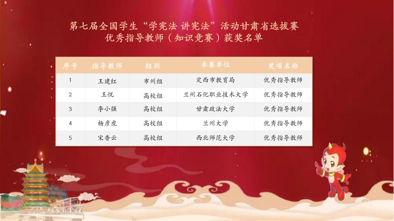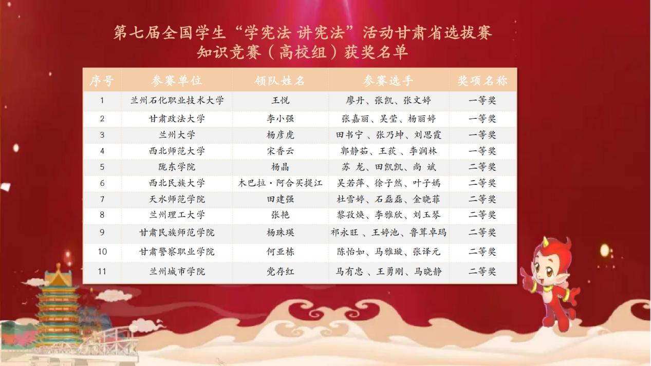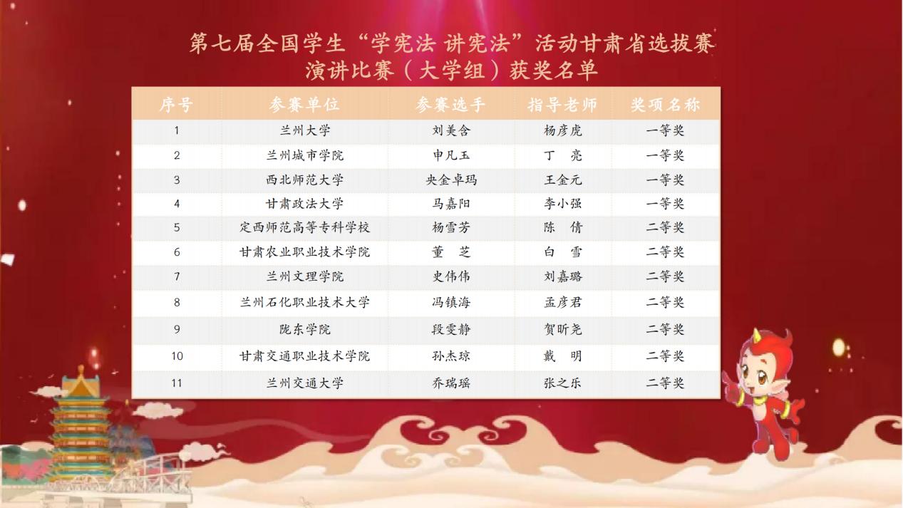 为深入学习宣传贯彻党的二十大精神,认真学习贯彻习近平法治思想,持续推进宪法学习宣传教育,11月8日至9日,由甘肃省教育厅主办,甘肃政法大学和甘肃省法制教育培训与研究中心承办的第七届全国员工“学宪法 讲宪法”活动甘肃省选拔赛顺利落下帷幕。