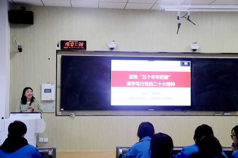 孟彦君老师以“聚焦“五个牢牢把握”,深学笃行党的二十大精神”为主题展开宣讲,重点围绕牢牢把握过去五年工作和新时代十年伟大变革的重大意义;牢牢把握习近平新时代中国特色社会主义思想的世界观和方法论;牢牢把握以中国式现代化全面推进中华民族伟大复兴的使命任务;牢牢把握以伟大自我革命引领伟大社会革命的重要要求;牢牢把握团结奋进的时代要求等五个方面内容深刻阐述党的二十大精神实质。引导同学们深入学习政治理论,不断提高政治站位,打牢思想基础,明晰新时代使命,扛起历史赋予新时代老员工的责任。